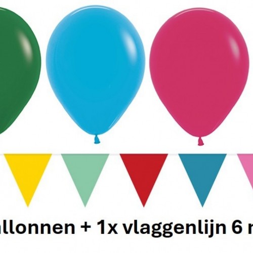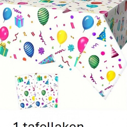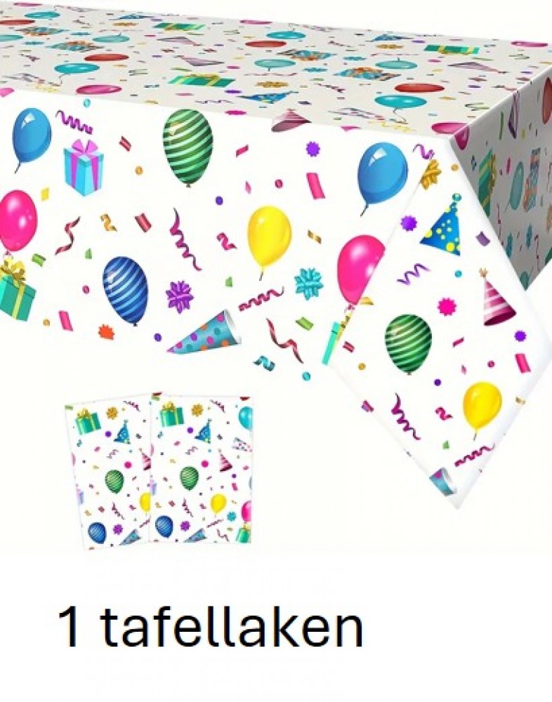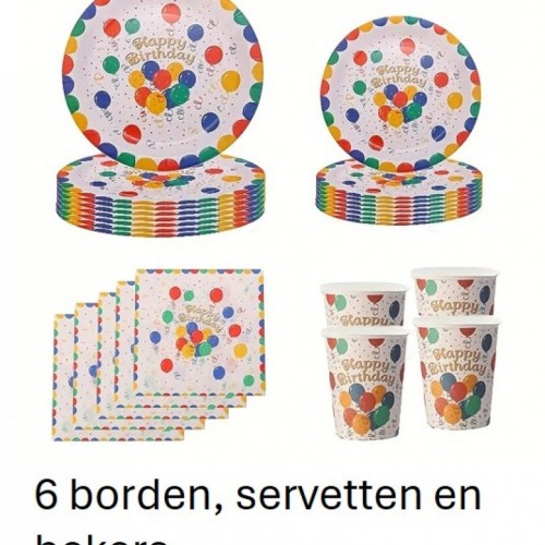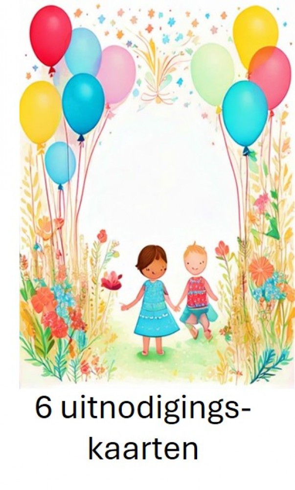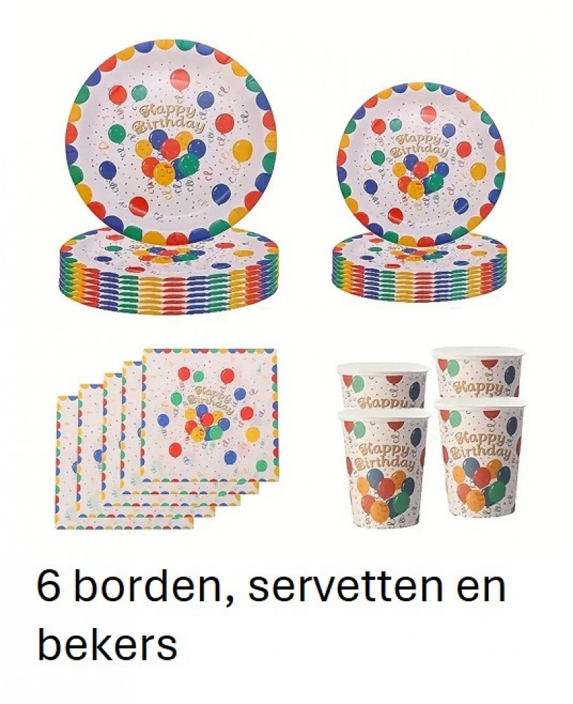 6 uitnodigingskaarten 1 tafelkleed 6 ranjabekers 6 servetten 6 kartonnen borden 10 latex ballonnen 1 vlaggenlijn meerkleurig 6 meter