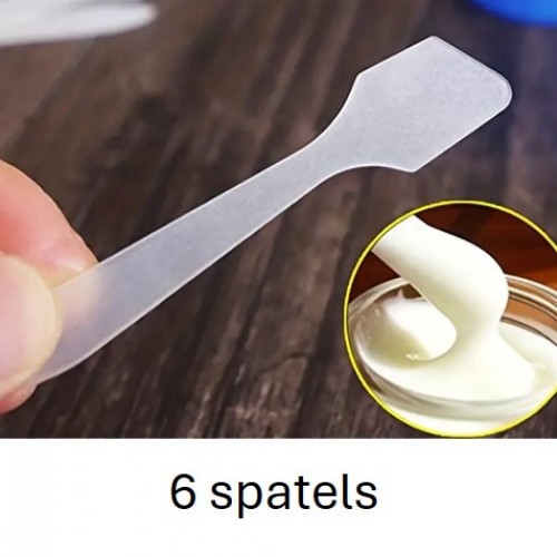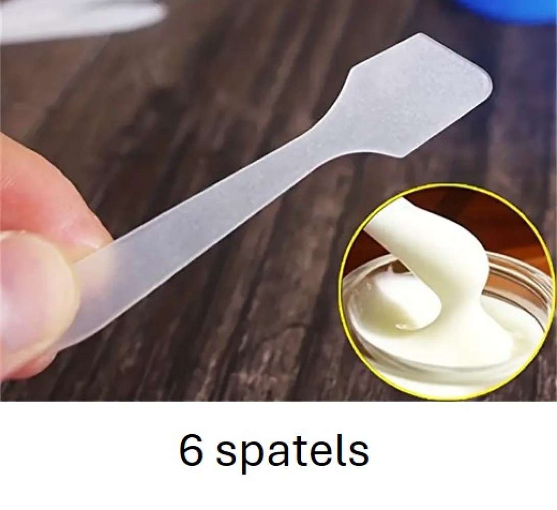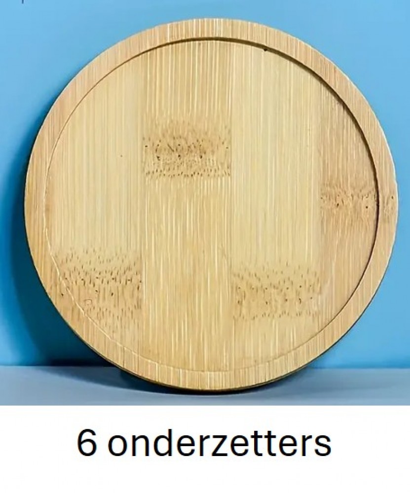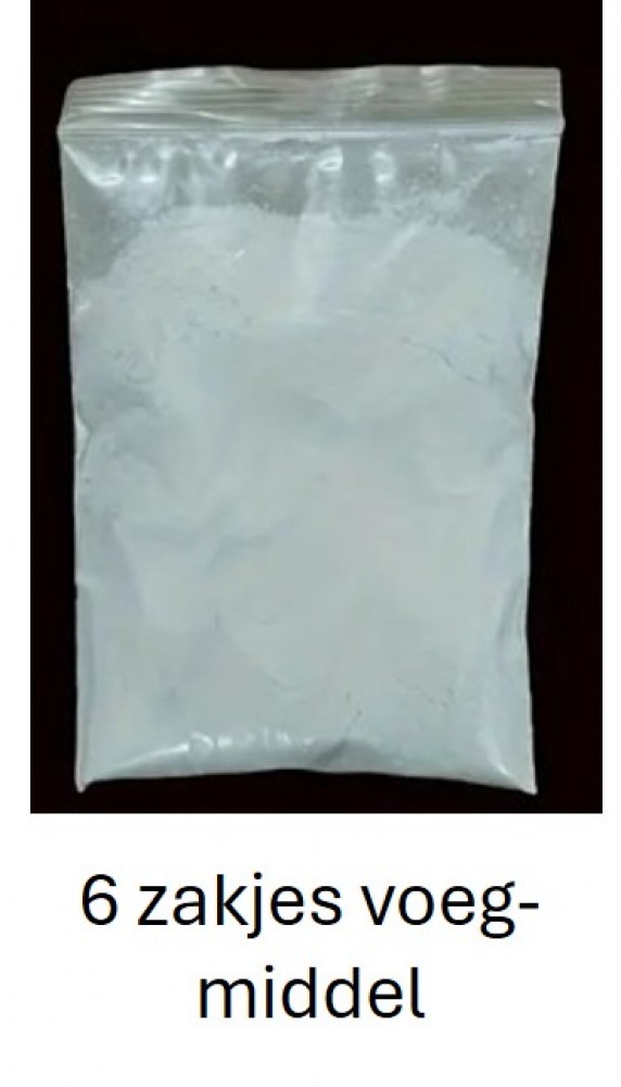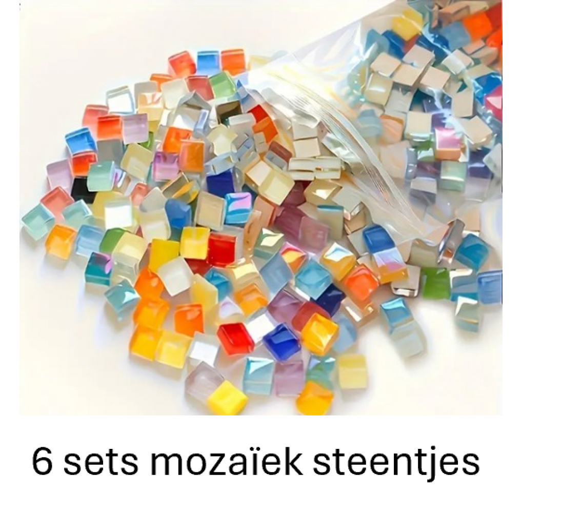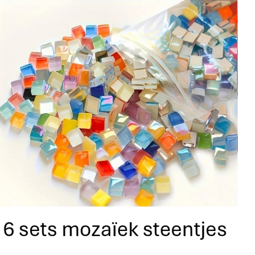 6 schorten 6 houten mozaïek ondergrond rond 9,5 cm 6 set mozaïek steentjes 1 potje houtlijm + 3 kwastjes 3 sponsjes 6 zakjes fijne witte voeg 6 spateltjes